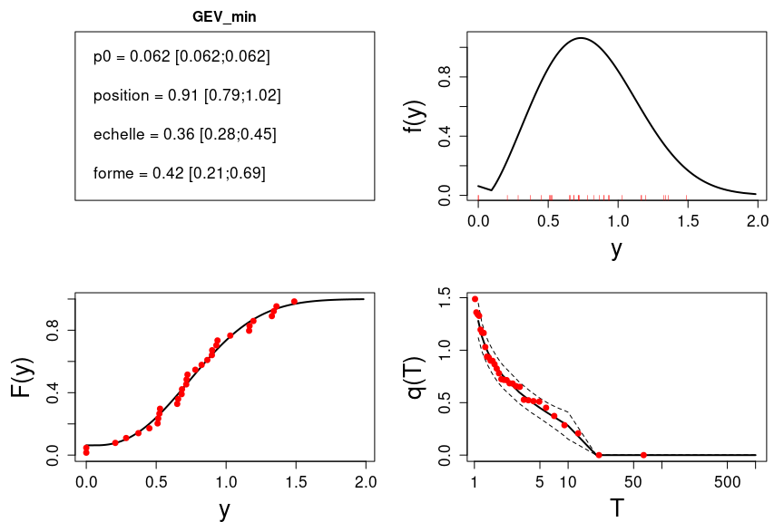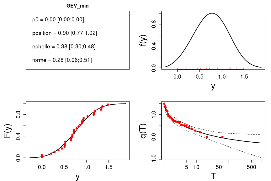 L’estimation de la distribution ‘GEV_min’ est illustrée ci-dessous. Comme on s’interesse aux extrêmes bas il faut penser à modifier l’option invertT comme précédemment décrit.