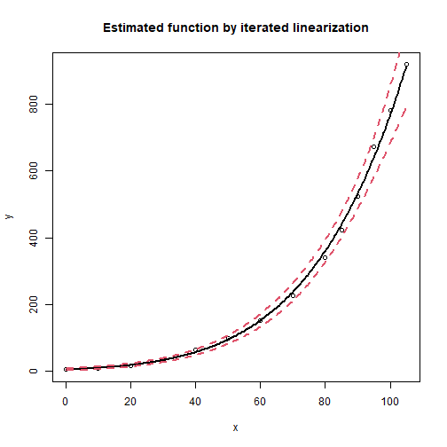 plot(st1, signif.level = 0.05, interval = "conf", main  = "Estimated function by iterated linearization")