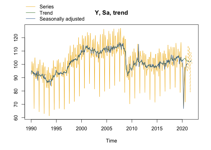 RJDemetra is an R interface to JDemetra+, the seasonal adjustment software officially recommended to the members of the European Statistical System (ESS) and the European System of Central Banks. JDemetra+ implements the two leading seasonal adjustment methods TRAMO/SEATS+ and X-12ARIMA/X-13ARIMA-SEATS.