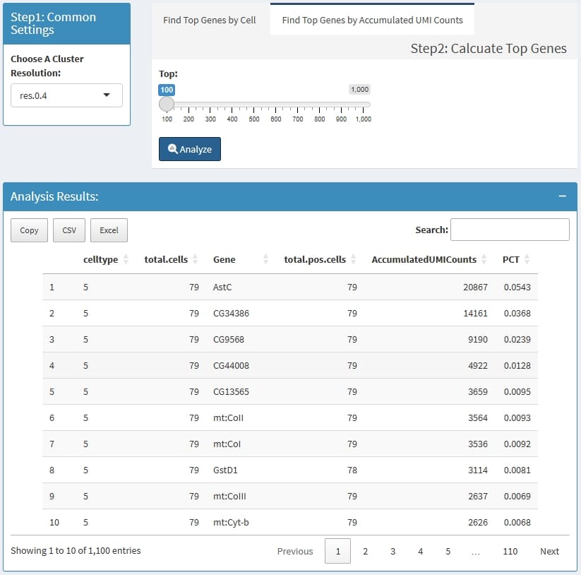 A: - Find Top Genes by Cell: Identifies genes that are highly expressed in individual cells, useful for finding cell-specific markers - Find Top Genes by Mean UMI: Finds genes with high average expression across all cells in a cluster, useful for identifying cluster characteristics