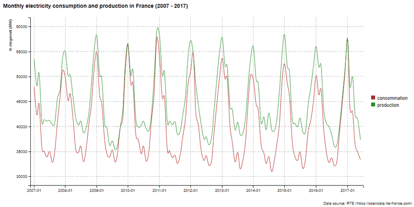 bb_labs(title = "Monthly electricity consumption and production in France (2007 - 2017)",