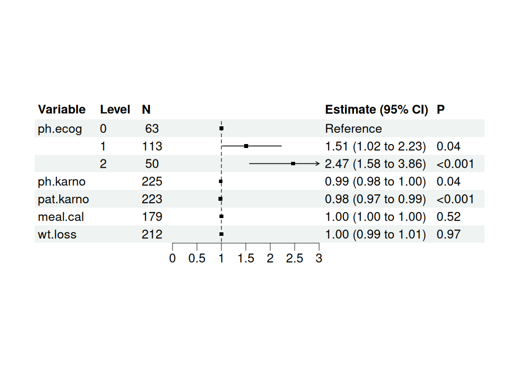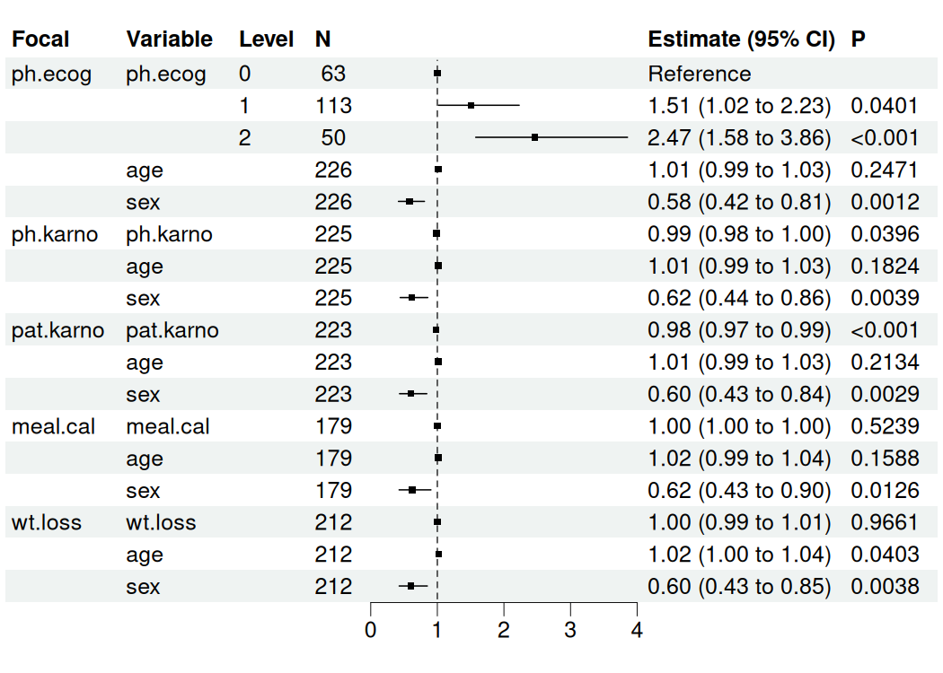 #> ph.karno | ph.karno | 0.99 | 5.95e-03 | -2.06 | 0.040 | [0.98, 1.00]
