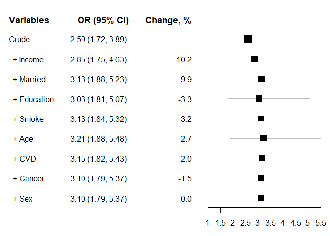 The ‘chest’ package can be used to assess confounding effects by comparing effect estimates from many models. It calculates the changes in effect estimates by adding one of many variables (potential confounding factors) to the model sequentially in a stepwise fashion. Effect estimates can be regression coefficients, odds ratios and hazard ratios depending on the modelling methods. At each step, only one variable that causes the largest change in the effect estimates among the remaining variables is added to the model. Effect estimates and change (%) values are presented in a graph and data frame table. This approach can be used for assessing confounding effects in epidemiological studies and bio-medical research including clinical trials.