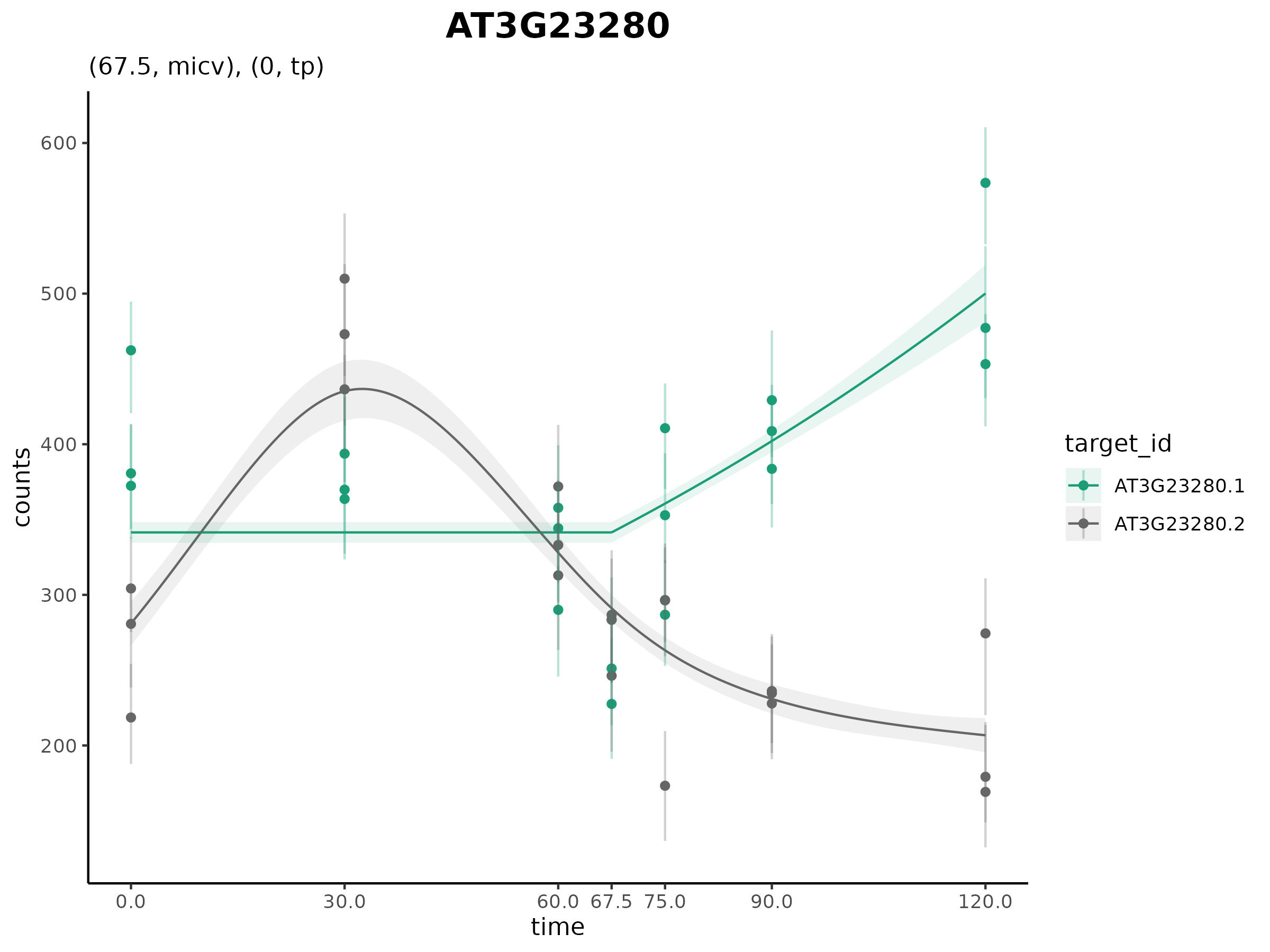 Isoform 1 (AT3G23280.1) has a changepoint at 67.5 min and has a monotonic increasing concave (micv) shape. Isoform 2 (AT3G23280.2) has no changepoint and has an unconstrained thin-plate (tp) shape.