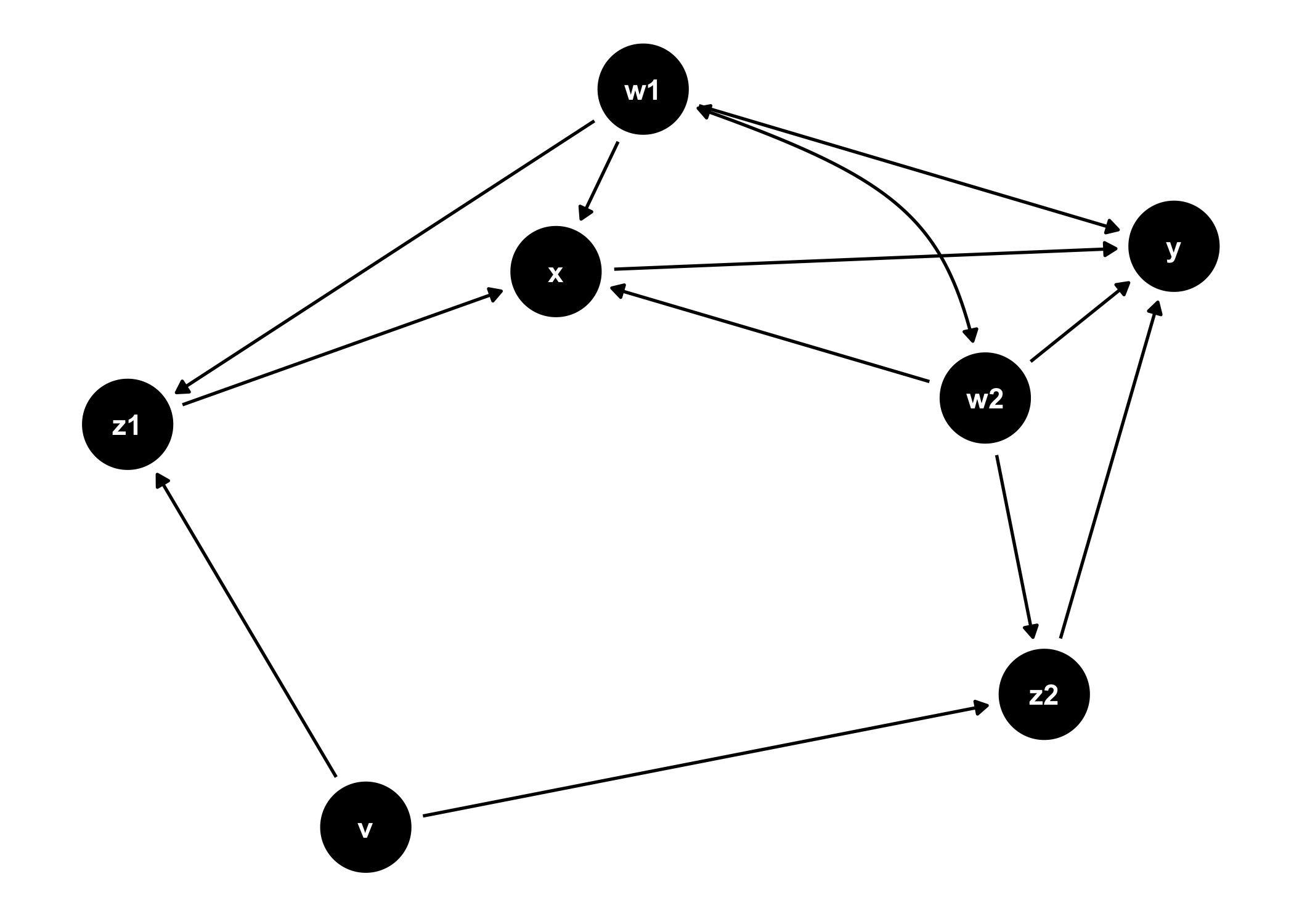 y <- x <- z1 <- v -> z2 -> y