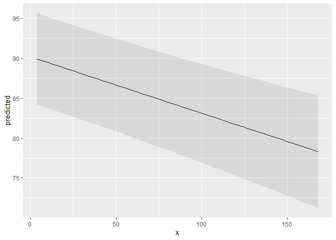 The returned data frames always have the same, consistent structure and column names, so it’s easy to create ggplot-plots without the need to re-write the function call. x and predicted are the values for the x- and y-axis. conf.low and conf.high could be used as ymin and ymax aesthetics for ribbons to add confidence bands to the plot. group can be used as grouping-aesthetics, or for faceting.