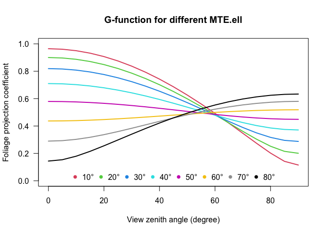 From the Ellipsoidal distribution function it is also possible to calculate the Foliage projection function (G-function; \(G(\theta)=k(\theta,x)\times cos(\theta)\) based on the MTA.ell: