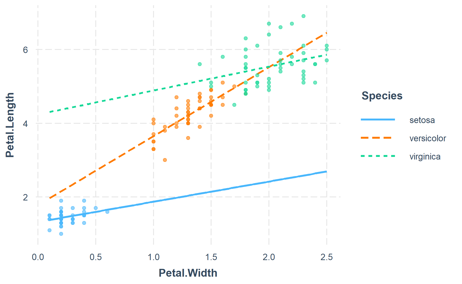 interact_plot(fitiris, pred = Petal.Width, modx = Species, plot.points = TRUE)