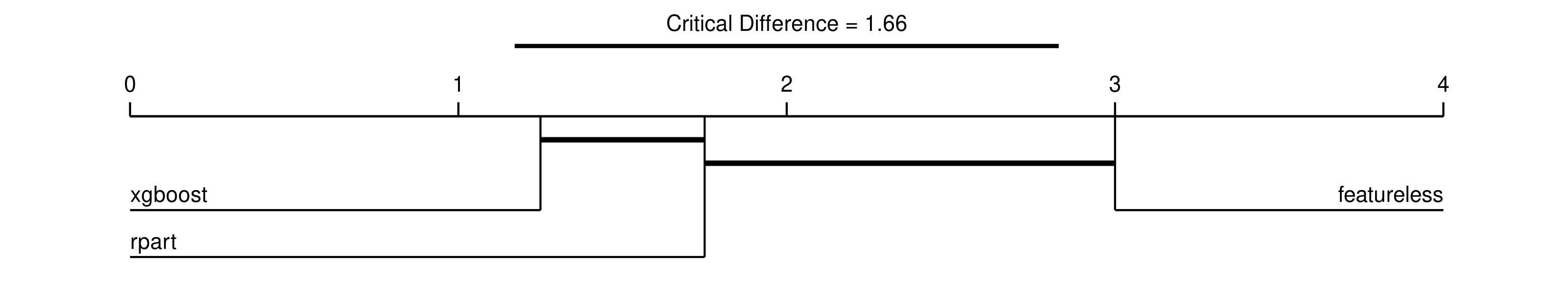 remotes::install_github("mlr-org/mlr3benchmark")Currently mlr3benchmark only supports analysis of multiple learners over multiple tasks. The current implemented features are best demonstrated by example!