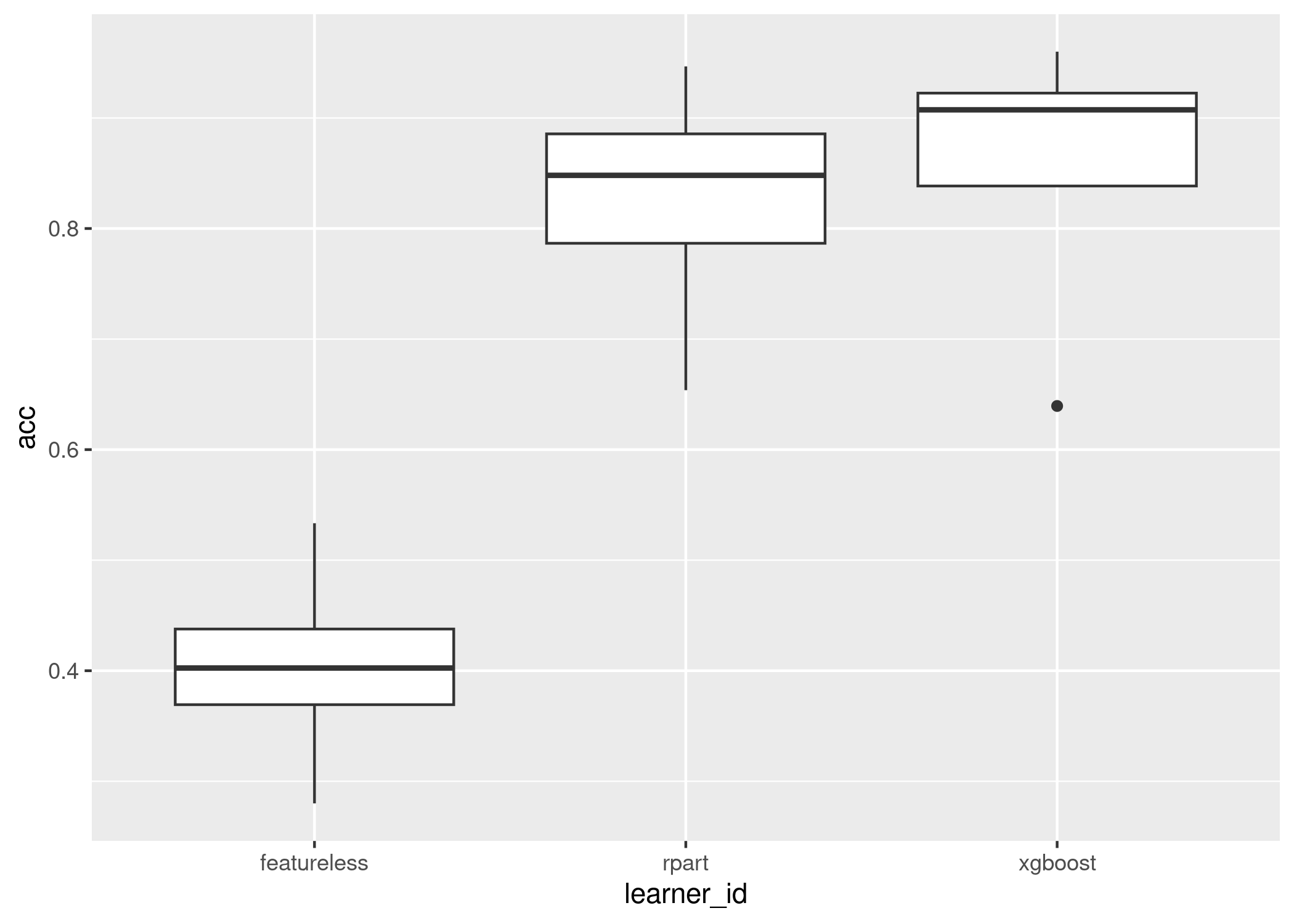 bm = benchmark(benchmark_grid(task, learns, rsmp("cv", folds = 3)))Now we create a BenchmarkAggr object for our analysis,