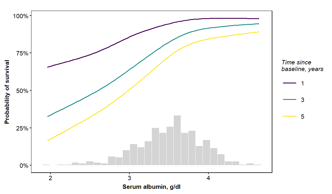 vdplot(object=orsf, xvar='albumin', xlab='Serum albumin',