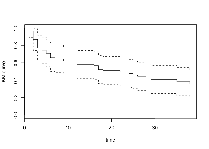 plot(optband_s, xlab = "time", ylab = "KM curve", mark.time = FALSE)