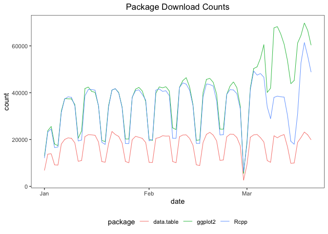 The “spell check” or validation of packages described above, requires some additional background downloads. While those data are cached via the ‘meomoise’ package, this will add time the first time cranDownloads() is run. For faster results, you can bypass those features by setting pro.mode = TRUE. The downside is that you’ll see zero downloads for packages on dates before they’re published on CRAN and zero downloads for mis-spelled/non-existent packages. You’ll also won’t be able to use the to = argument by itself.