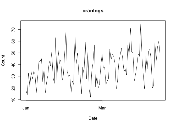 Second, when plotting cranDownloads() two gray polygons to highlight those dates are added to the graph and are labeled with a “⌀” (empty set) on the top axis. Third, smoothers ignore these missing dates.