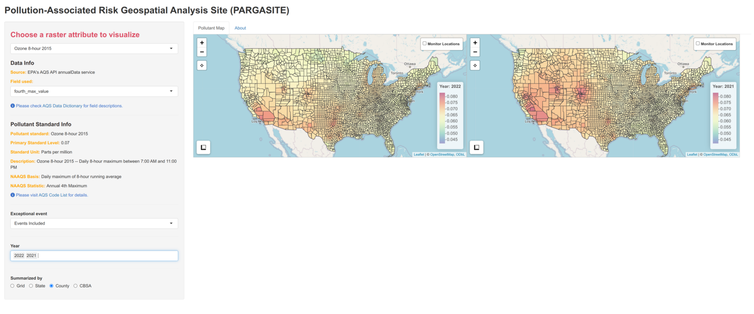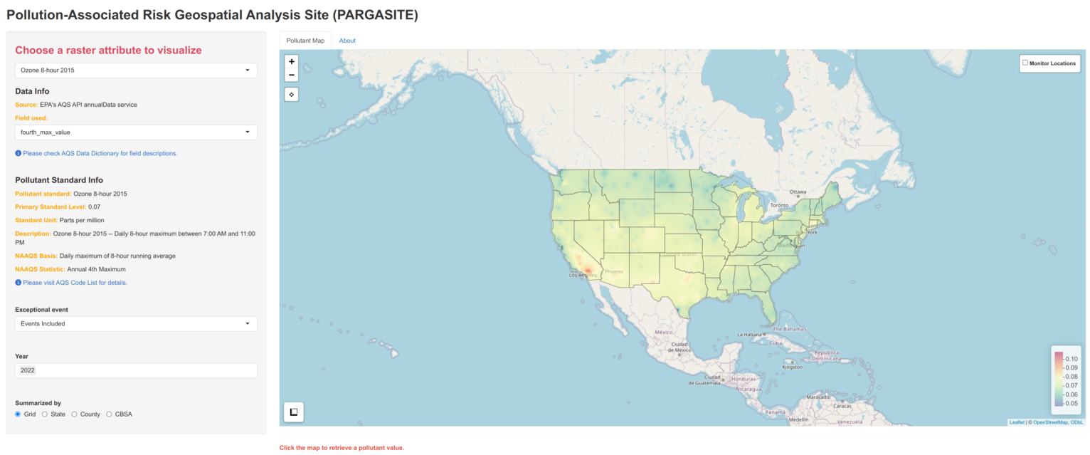 The pargasite package offers tools to estimate and visualize levels of major pollutants (CO, NO2, SO2, Ozone, PM2.5, and PM10) across the conterminous United States for user-defined time ranges. It provides functions to retrieve pollutant data from the Environmental Protection Agency’s (EPA) Air Quality System (AQS) API service for interactive visualization through a Shiny application, allowing users to explore pollutant levels for a given location over time relative to the National Ambient Air Quality Standards (NAAQS).