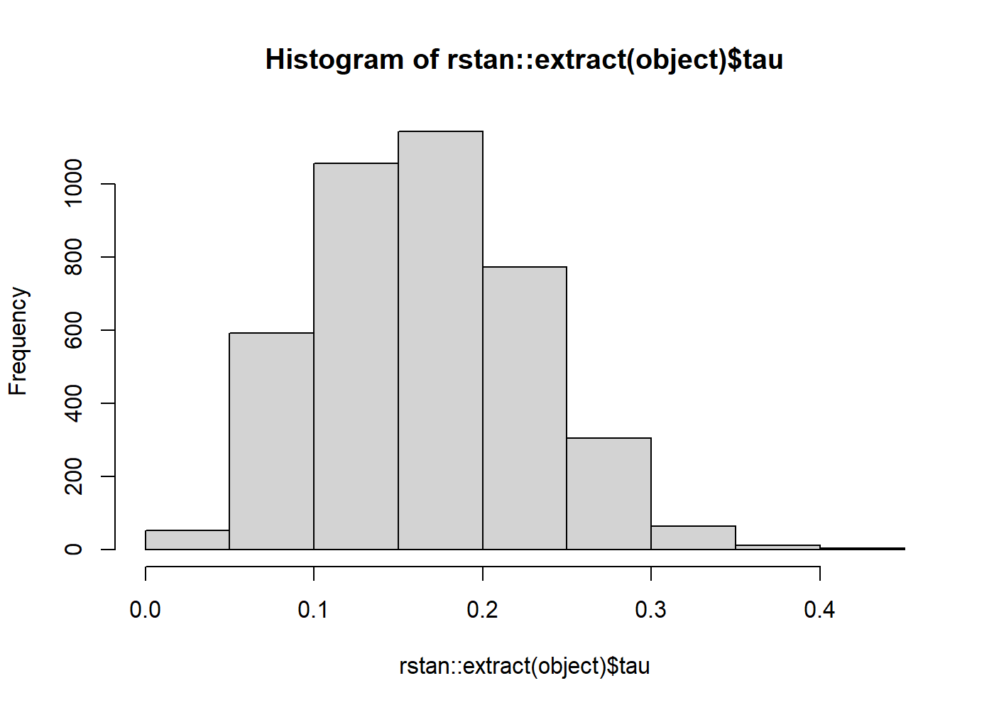 If you wish to plot a histogram of the posterior distribution of tau, the standard deviation of the effect size distribution, you can do it like this: