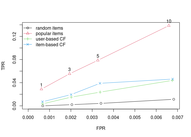 results <- evaluate(scheme, algorithms, type = "topNList", n = c(1, 3, 5, 10), progress = FALSE)