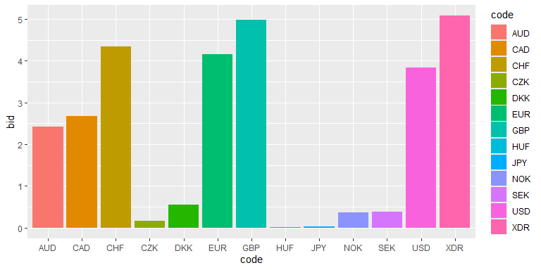 ggplot(current_exchangerate_table, aes(x = code, y = bid, fill = code)) +