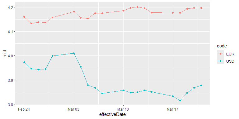 ggplot(currency_data, aes(x = effectiveDate, y = mid, col = code)) +