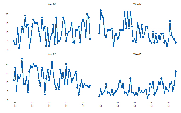 This package makes no attempt to identify or highlight ‘trends’ (consecutively increasing or decreasing points) or shorter ‘shifts’ of runs below the median. In 8 years of working with QI data, I very rarely see trends, and when they do appear, they tend to result after a period of process degradation, when the process begins to return back to its natural median state.