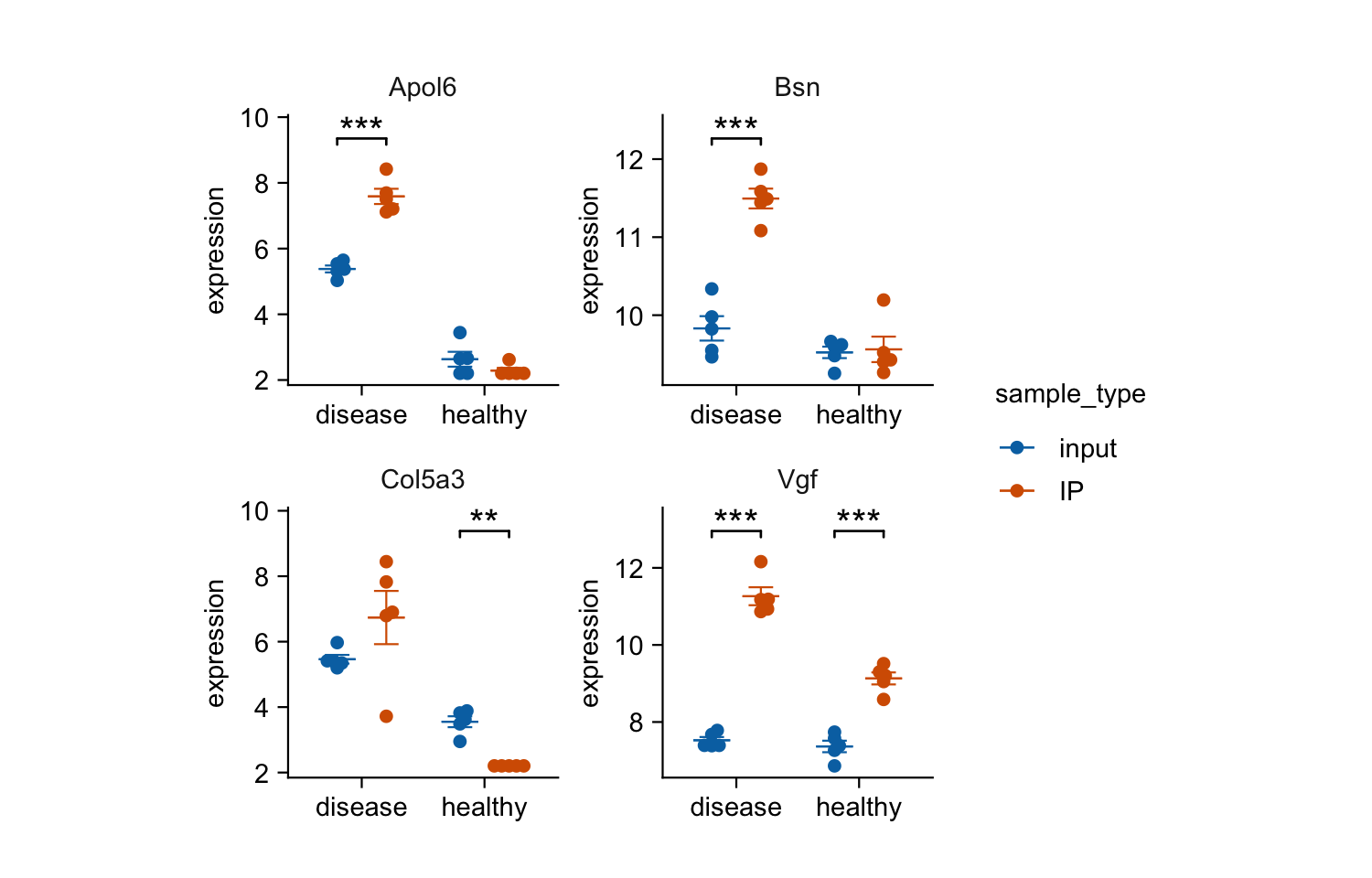 tidyplot(x = condition, y = expression, color = sample_type) |>