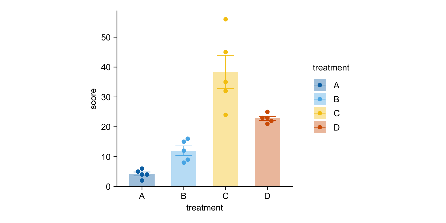 tidyplot(x = treatment, y = score, color = treatment) |>