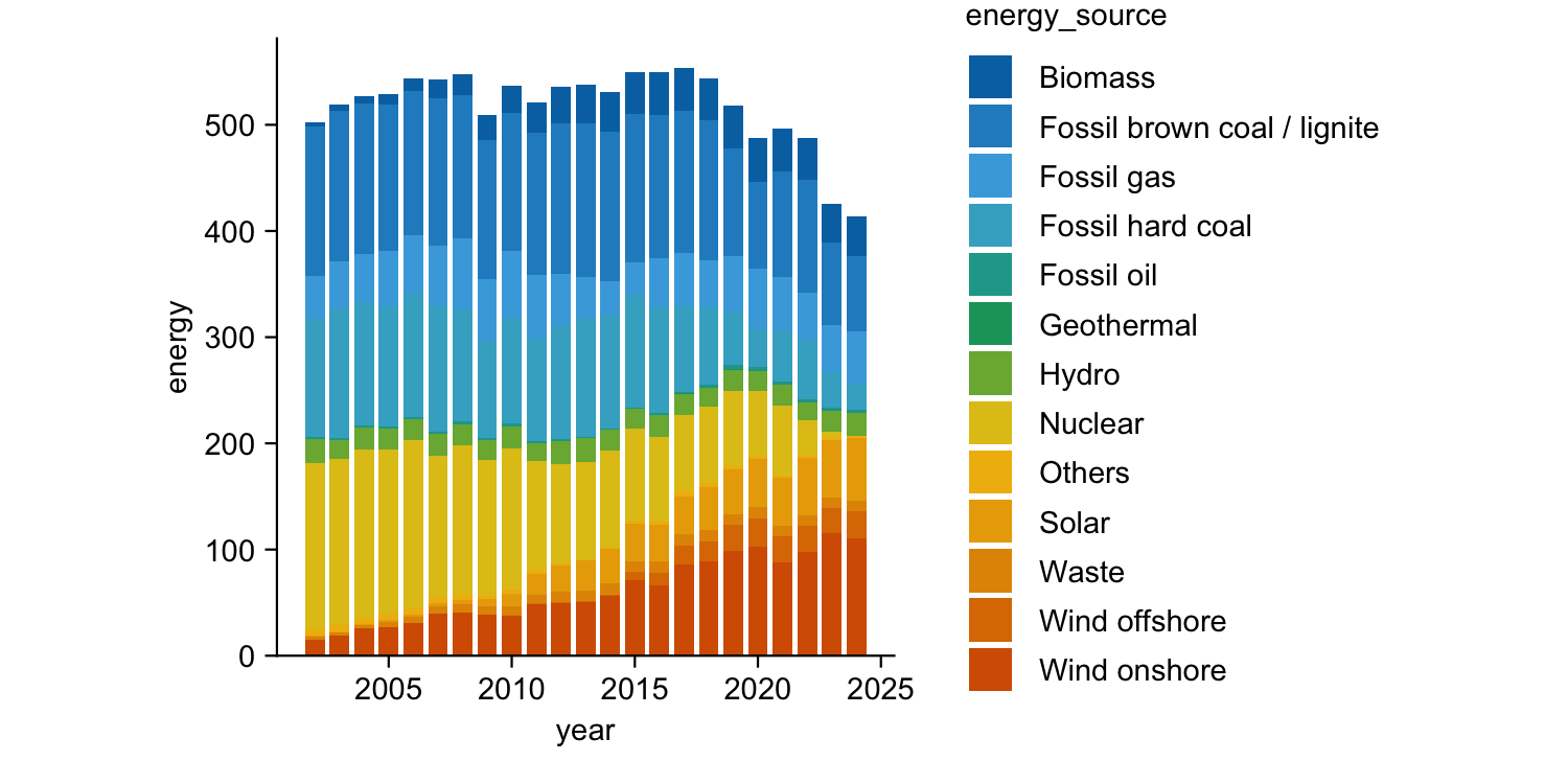 tidyplot(x = year, y = energy, color = energy_source) |>