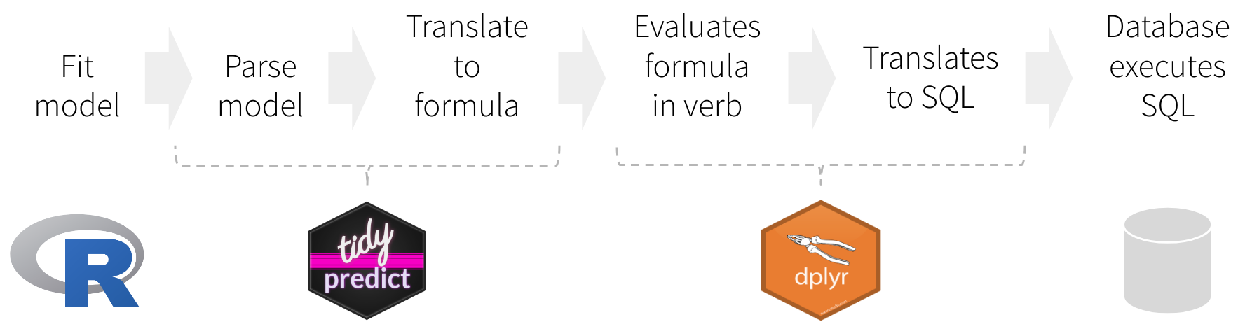 model <- lm(mpg ~ wt + cyl, data = mtcars)tidypredict can return a SQL statement that is ready to