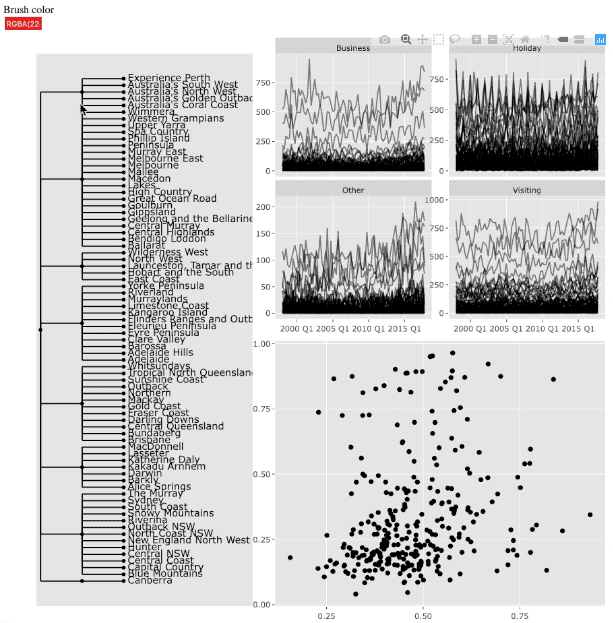 Multiple displays are constructed: (1) the overall tree plot in the left panel, (2) the time series plot in the top right, and (3) the scatterplot representing featured metrics for each series, produced by the features(). All known functions here, but (yes) generate linking views.