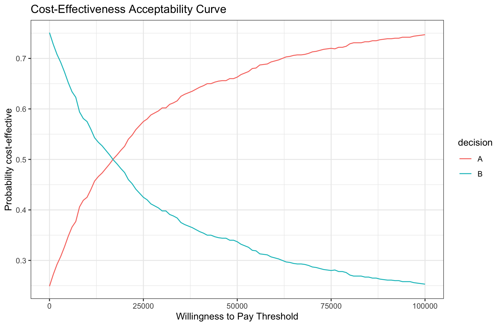 We can also plot the cost-effectiveness acceptability curve (CEAC) using a range of willingness to pay (WTP) thresholds: