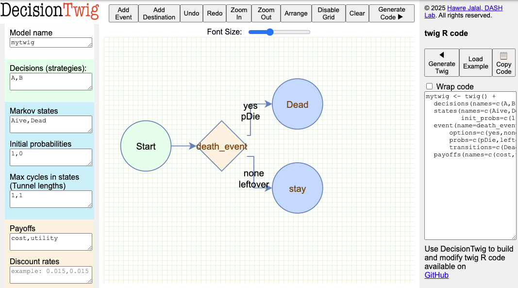 twig is an R package for building decision and cost-effectiveness analyses. Below we provide instructions to install the twig R package, a simple Markov model example, and reference two cost-effectivenss tutorials, one on a time-dependent Markov model and the other on a decision tree. For building twig syntax interactively, you can use DecisionTwig which is an online graphical user interface for developing twig syntax.