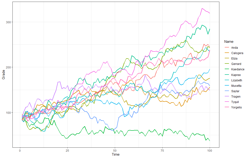 ggplot(aes(x = Time, y = Grade, color = Name, group = Name)) +